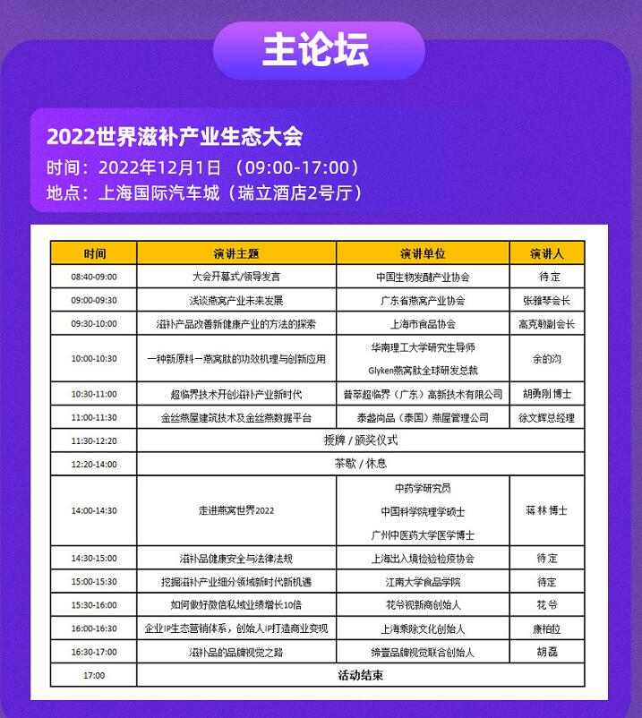上海燕博会的参展商、合作伙伴、专业观众及行业单位,共同期盼已久的行业盛会因疫情管控导致再次延期,使线下洽谈交流合作增加阻碍,为弥补燕窝与滋补品人线下洽谈交流机会,“2022世界滋补产业生态大会暨品牌展示会”于2022年12月1日在上海国际汽车城瑞立酒店(上海嘉定区安亭镇博园路6966号)盛大举行;围绕“融合产业新发展·构建滋补新生态”为主题;将来自100家燕窝品牌企业携千款燕窝、燕窝衍生品、滋补品、益生菌、酵素等源头工厂、供应商集中展示,同时邀请了行业权威专家、500家上下游行业大咖参会、参观,共同探索燕窝滋补品领域,为滋补同仁提供交流和经验分享的绝佳机会。