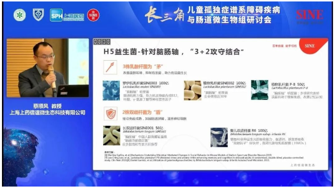 会中,上药信谊微生态科技的首席科学家蔡顺风博士也进行了《复合益生菌H5对儿童行为问题的营养干预》主题分享,给大家介绍了信谊品牌益生菌的研发历史和菌种资源,并重点介绍了信谊H5益生菌在儿童行为问题方面的“脑肠轴”干预原理。