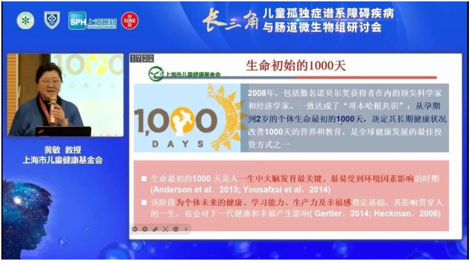 上海市儿童健康基金会理事长黄敏教授在会议中为大家介绍了儿童早期发展的挑战,黄教授指出,从孕期到2岁的个体生命最初的1000天决定其长期健康状况,是人一生中大脑发育最关键、最易受到环境因素影响的时期。2008年哥本哈根共识也提出:改善生命早期1000天的营养和教育,是全球健康发展的最佳投资之一。儿童早期的成长发育应给予更多关注。