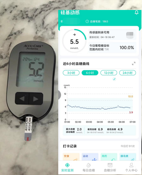 重点来了,动态血糖仪可以实时监测血糖变化情况。这款硅基动感把每间隔5分钟生成的血糖数据上传到手机APP上,血糖分析和数据显示都非常直观,让使用者能够一目了然的观察到每个时间段自身血糖的波动情况。