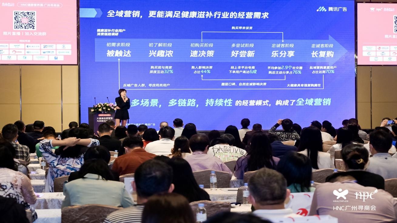 腾讯广告健康滋补行业全国负责人张璐,进行了主题为《从流量到留量:腾讯全域经营生态,助力品牌新增长》的分享。她提到,健康滋补行业持续增长,商品、人群越加细分化,从腾讯视角观察了到商品的六大变化:1.滋补日常化2.即食化、口袋化3.复合/关联功效4.用户年轻化5.购买渠道多样化6.传统+新成分。品牌如何应对这六大趋势?全域经营成为解法。腾讯生态的全域经营具有多场景、多链路、真私域的优势,能够在用户需求的各个阶段,为商家提供全链路的解决方案。