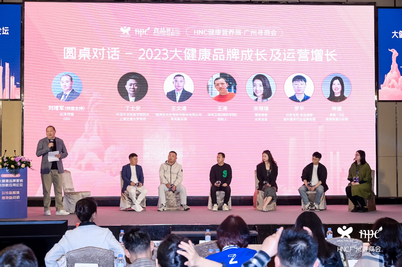 从左至右:众泽传媒CEO刘增军(主持)、叶茂中冲突商学院院长 丁士安、威海百合常务副总裁 王文通、深圳卫视《辣妈学院》创始人 王涛、薄荷健康业务总监 宋珊珊、抖音滋补膳食行业运营经理 罗平、果集·飞瓜首席数据分析师 神婆