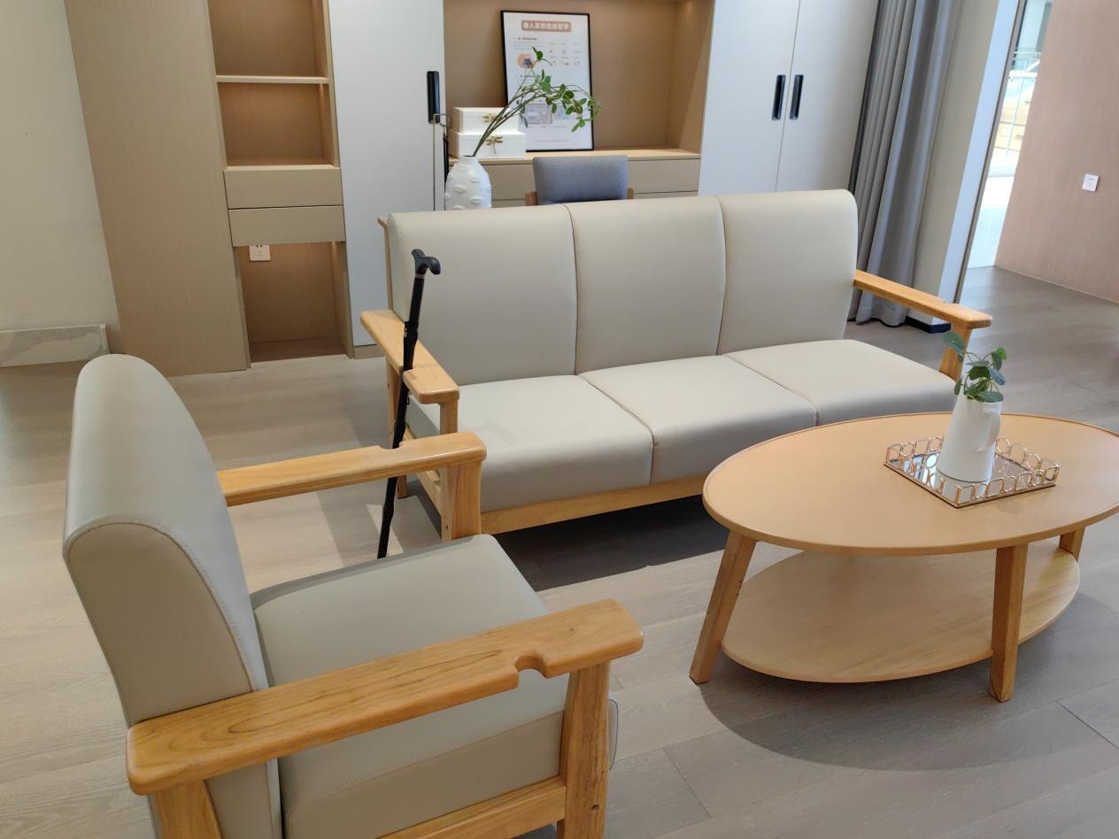 客厅区域设计依照老年人生活及活动特殊要求,定制一系列适老化家居。茶几增加扶手助力老人起身、加厚加宽设计的沙发更适合老年人长时间坐着,与沙发高度齐平的边柜,更适合老年人方便拿取物品,处处体现“以人为本、关爱老人”的设计。