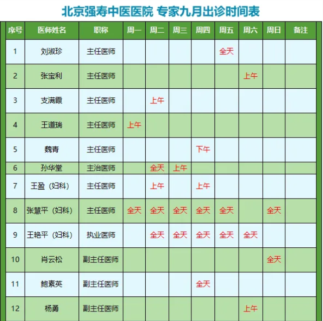 北京强寿中医医院以弘扬中华医药精粹,普及大众健康为己任。是一所中医特色突出、临床疗效显著的中医医院。为进一步提升医疗服务质量,完善患者就医体验,为您的就诊提供便利,现整理专家九月出诊时间安排如下: