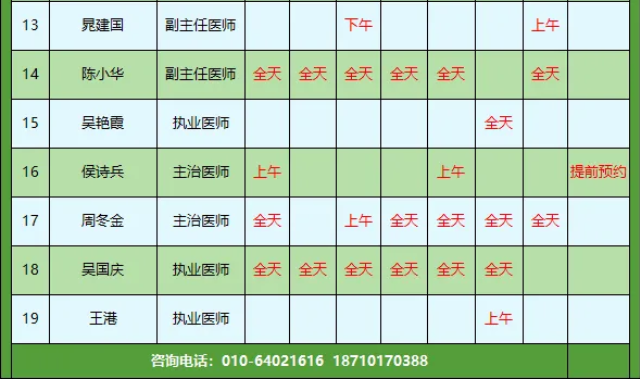 2.如遇特殊情况,个别医生出诊时间会稍有变动,就诊前请联系客服确认,具体排班以当天出诊为准,敬请谅解~