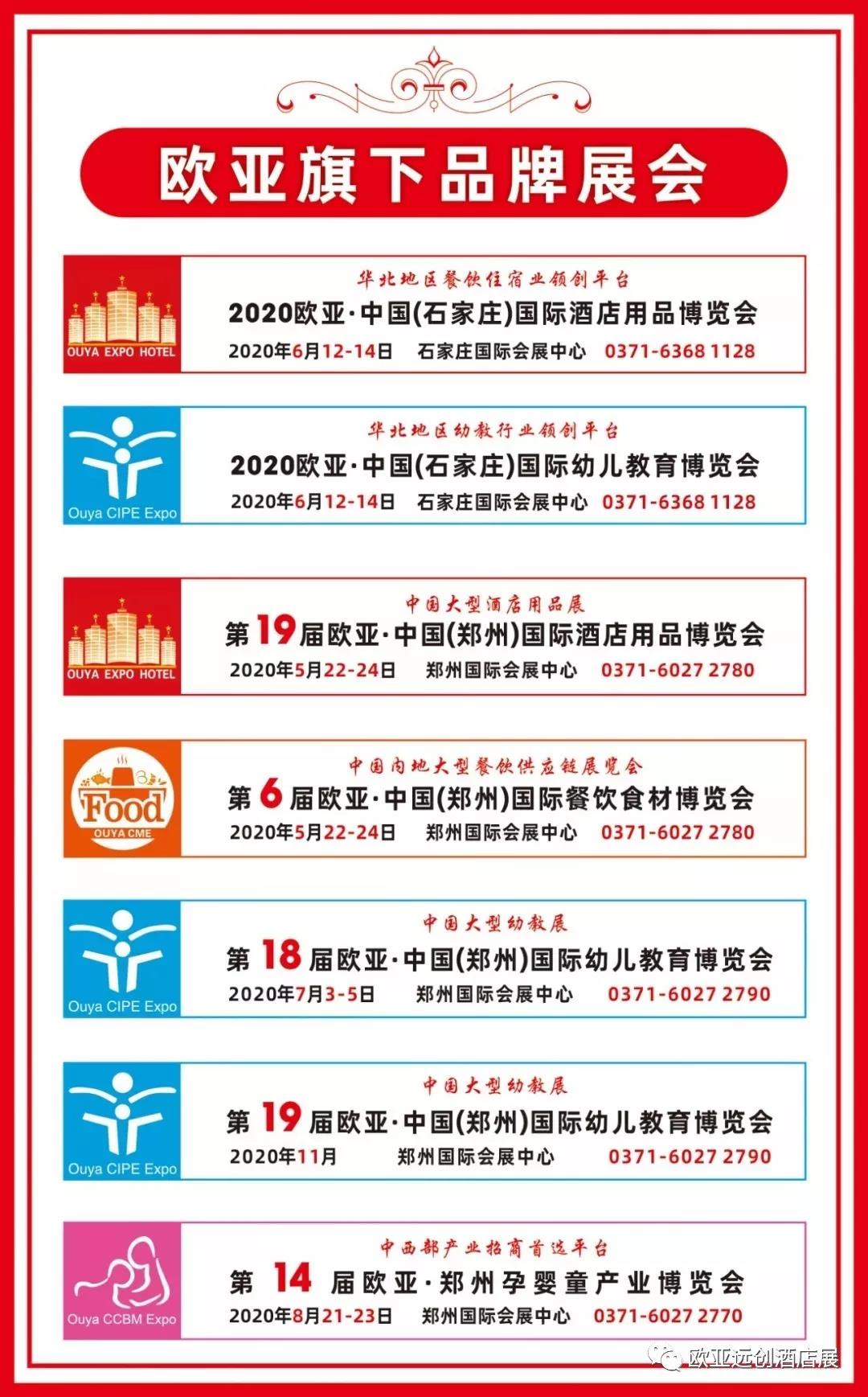 欧亚酒店用品展已经成功举办18届,现已成为中国大型酒店用品展之一,是中西部及华北地区最专业的采购、交流活动,酒店用品生产商、制造商、经销商必参的行业盛会,并在2019年实行了全国行战略,于2020年6月12-14日落地华北“石家庄”,由河南省餐饮与饭店行业协会、河北省饭店烹饪餐饮行业协会联合主办,在宣传过程中与北京商用厨具协会、天津商用厨具协会、石家庄久益酒店用品城及各城市酒店用品市场等达成合作,先后得到了中国烹饪协会、中国饭店协会,以及河南、河北、山西、山东、江苏、湖北、安徽等省行业协会共同参与和全面支持。