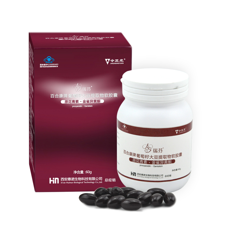 【成分】:葡萄籽提取物、大豆提取物、维生素E、大豆油、蜂蜡、明胶、甘油、棕氧化铁、胭脂红、水 标志性成分及含量:每100g含、原花青素7.53g、金雀异黄素9.6mg、维生素E1.223g